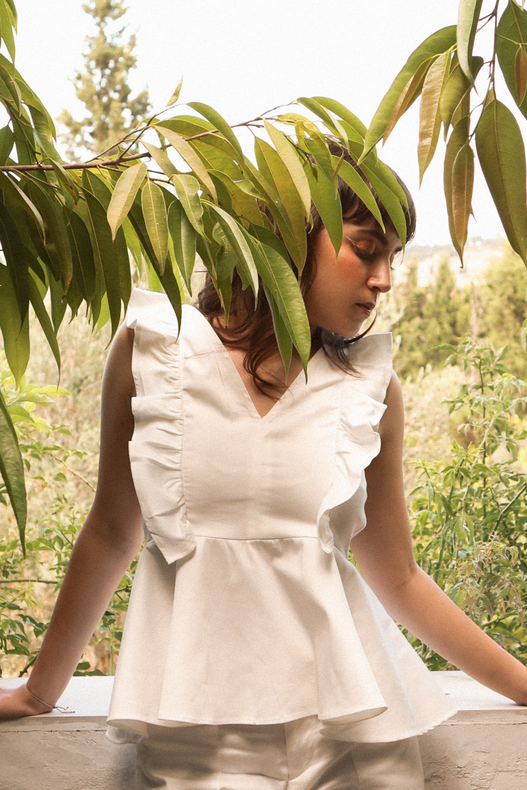 Mariposa Top is a light and elegant white cotton sleeveless top designed to move gracefully with the body. It features a delicate V-neckline at the front, while a soft ruffle flows from the shoulders, crossing the front and continuing to the back, finishing in a V shape at the lower back. A discreet back zipper ensures ease of wear, and all seams are carefully finished with bias binding, reflecting refined and durable craftsmanship. Feminine, airy, and timeless, it offers a subtle balance of movement, comfort, and effortless elegance.