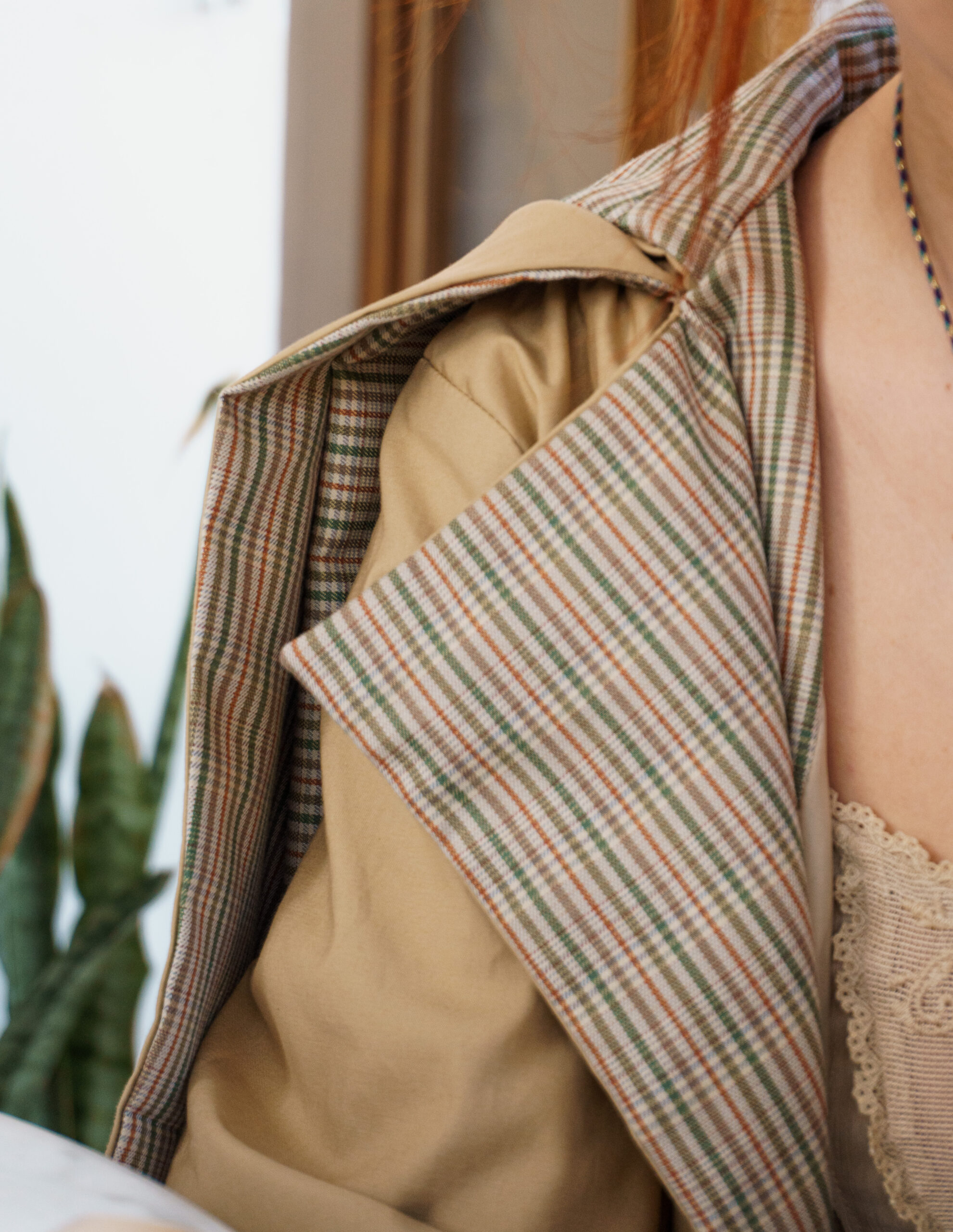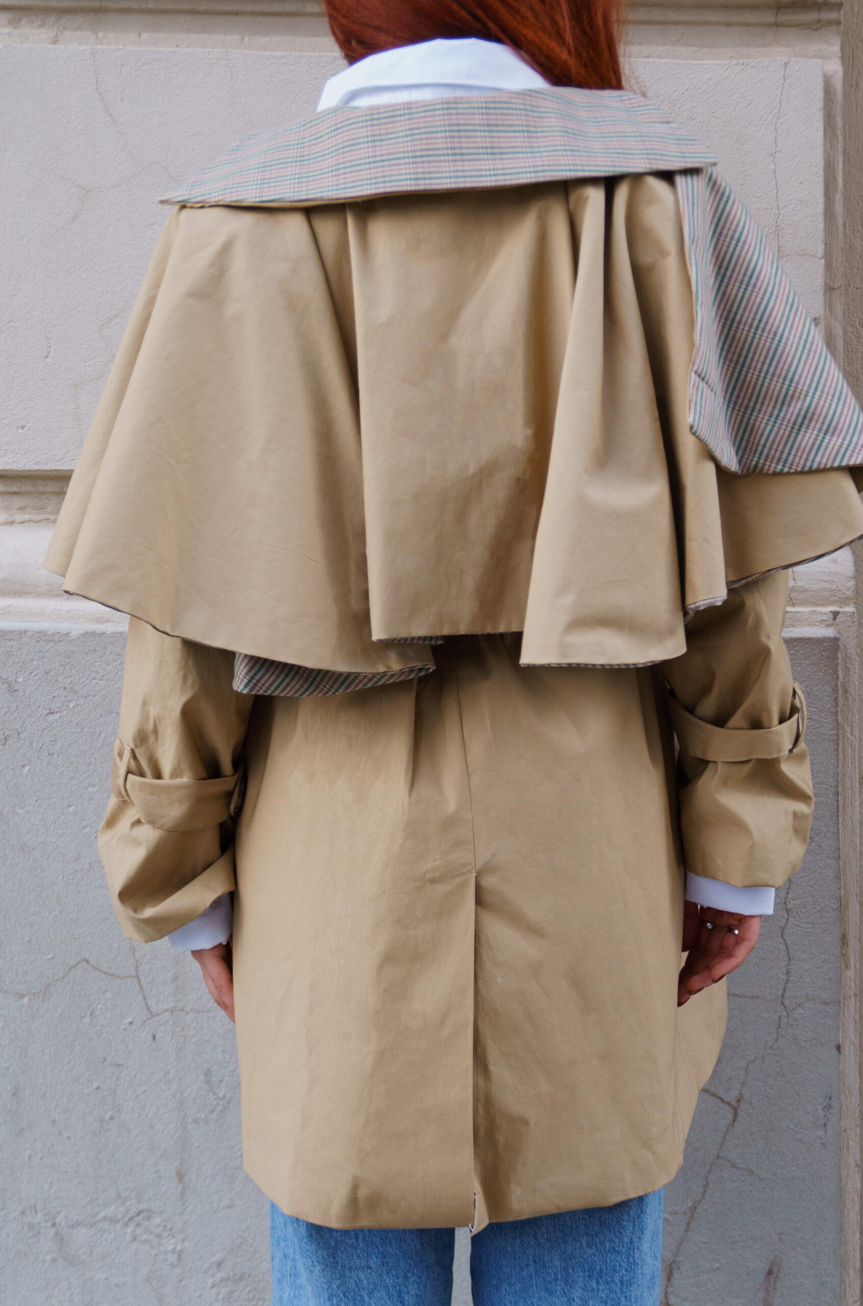 Rosy Checked Trench-Coat is a mid-thigh trench crafted in waterproof cotton gabardine, designed with a balanced volume that gently structures the silhouette while preserving fluidity. The collar, subtly turned toward the back, reveals a graceful and distinctive line, enhanced by refined checkered details where deep green, brown, white, and fine orange-red lines intertwine in a discreet pattern. A voluminous cape, attached at the neckline, flows around the shoulders and extends both at the front and back, bringing a sense of timeless movement.